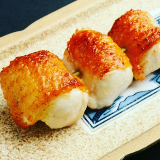 もも肉・ねぎ・むね肉・ねぎ・もも肉と刺してある最もポピュラーに比内地鶏を楽しんで頂くことができる串です。ねぎは国産のみを使用しており、ねぎの甘味が味のバランスを良くしております。