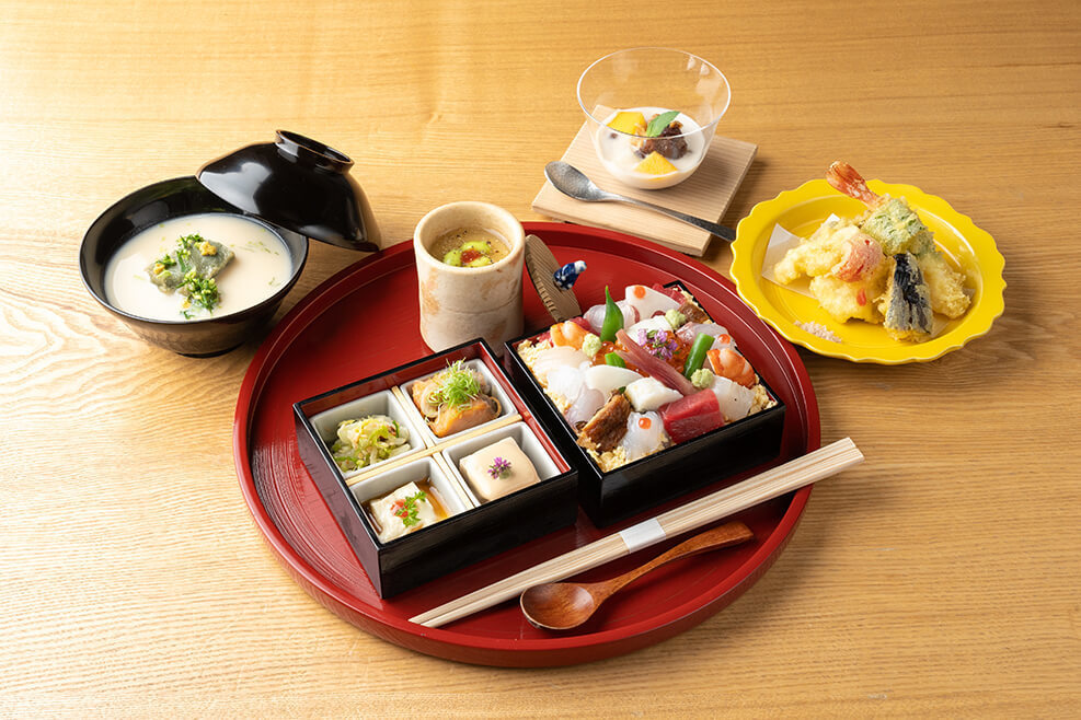 ・ちらし寿司・小鉢物・天ぷら・茶碗蒸し・京白味噌椀・甘味