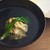 産直野菜をふんだんに用い、季節感豊かに盛り付けられたサラダです。サラダのベースを支えるのはポテトサラダ。半熟玉子を覆うイカスミのオランデーズソースを崩しながらいただきます。