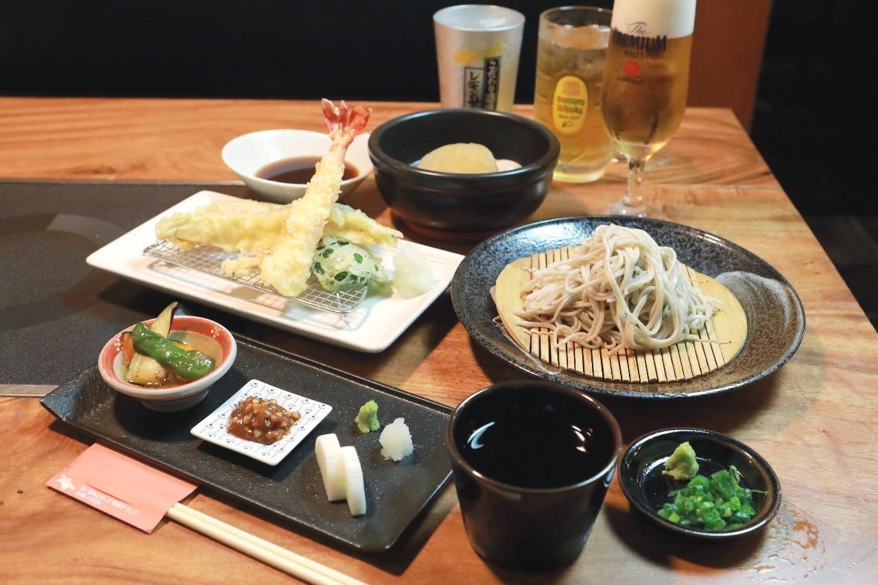 蕎麦出汁で味わうおでんや、海老・野菜が揚げたてで楽しめる天ぷらすなど、蕎麦屋ならではの贅沢を一皿ずつ堪能いただける特別セット。〆には香り高い十割蕎麦をご用意。さらに2ドリンクまで付いた充実の内容となっております。