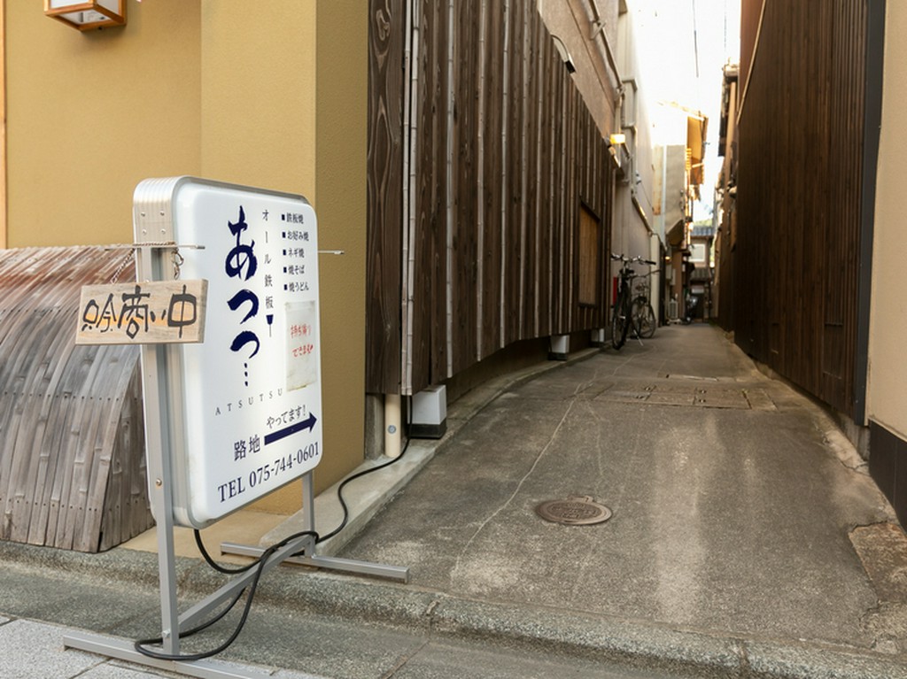 京阪本線、清水五条駅から徒歩8分にある【オール鉄板 あつつ…】は、京都五花街の一つ宮川町の裏路地に佇み、お好み焼きやネギ焼きが楽しめる鉄板焼き店です。オーナーの田邊氏は、京都東山にある有名鉄板焼き店【かな】で14年の修業を積み、味を継承。カウンター8席のみの店内には、カウンターと同じ長さの鉄板があり、目の前で焼き上げるスタイルです。調理中の音やにおいなどがゲストの五感を刺激し、ライブ感が味わえます。人気メニューは、【かな】の味を受け継いでいると評判の『ネギ焼き』や『お好み焼き』『焼きそば』など。早い時間は会社員や近所の方で、遅い時間は舞妓さんなど多数のゲストで賑わうお店です。