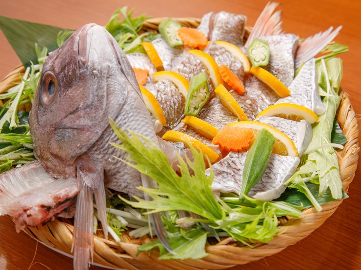 その日市場で選んだオススメの鮮魚を、たっぷりの野菜とともに蒸しあげた一品(写真は鯛)。豪華な尾頭付きなので見た目も迫力満点です。あっさりして食べやすく、大きな魚もペロリと食べられると好評だとか。