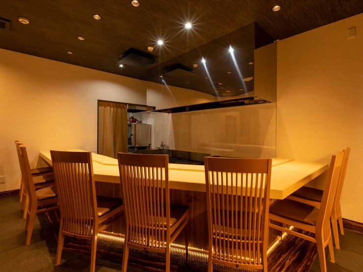 旬の新鮮な高級食材を使用した会席料理。オープンキッチンスタイルの日本料理店