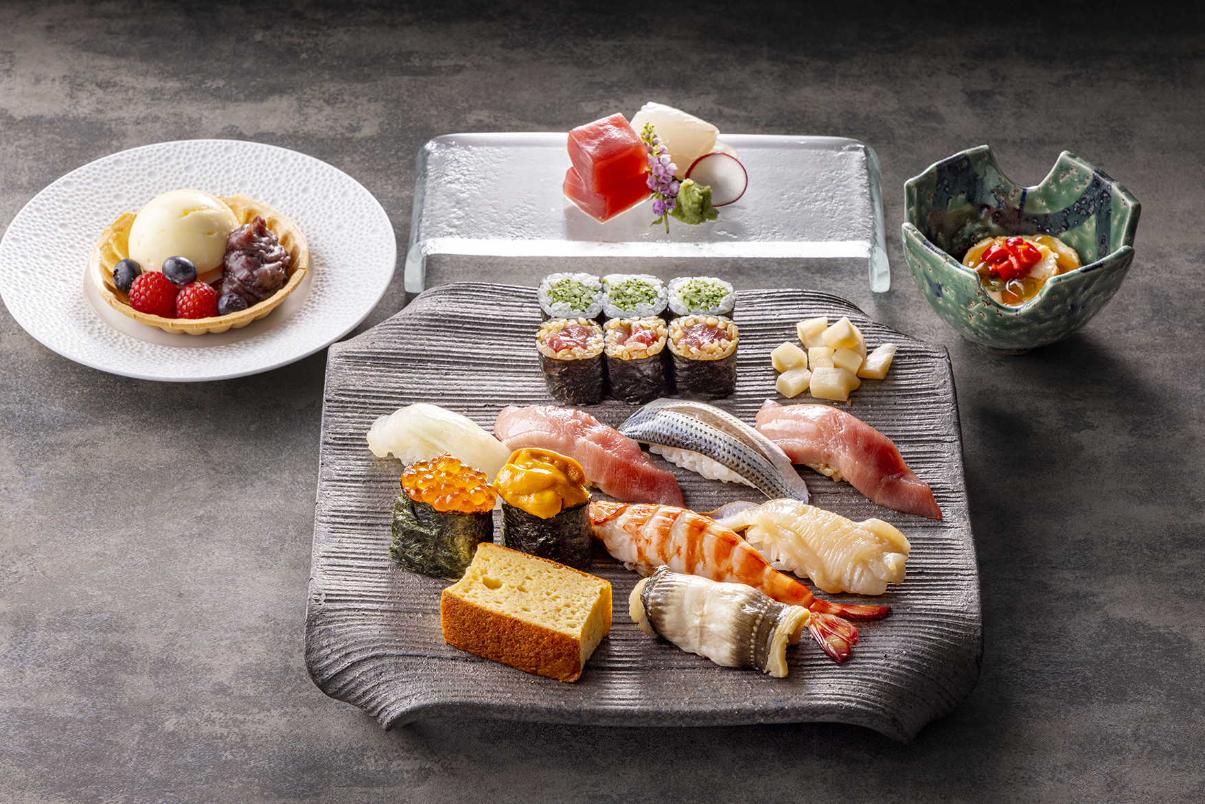 十二颯では、大切な人と過ごすディナータイムにおすすめの寿司コースをご提供しております。先付と二種のお造りから始まり、お寿司は大トロ、中トロ、雲丹など人気の握り九貫と巻物、玉子をご用意。丁寧な仕事で握られるお寿司からはネタの持ち味と職人の技を感じます。大切な友人や家族との時間、接待などの大切な席におすすめのプランでございます。