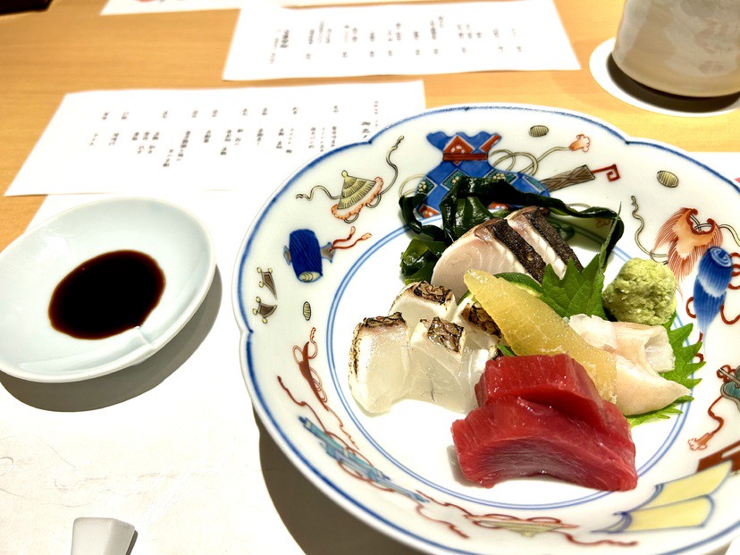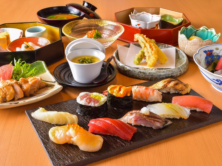 先付盛合せ、椀物、刺盛3点、焼物、蒸物、箸休、鮨7貫(巻物含む)、汁物、デザート
