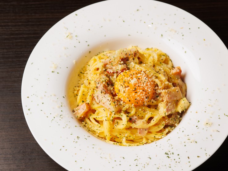 白ワインで香り高く仕上げた『2種のベーコンのクリーミーカルボナーラ』