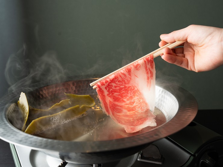 1人前からオーダーできる、しゃぶしゃぶセット。国産和牛のサーロインを昆布だしに潜らせ、ごまの風味を加えた醤油ベースの特製ダレで一口。オプションメニューも豊富で、さらに自分好みに楽しめます。