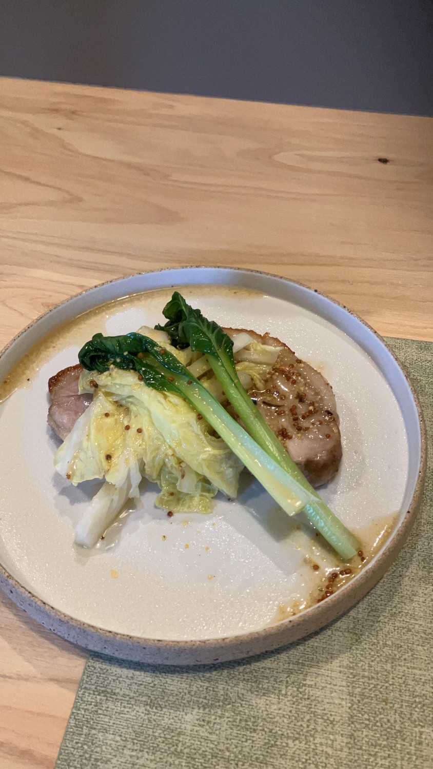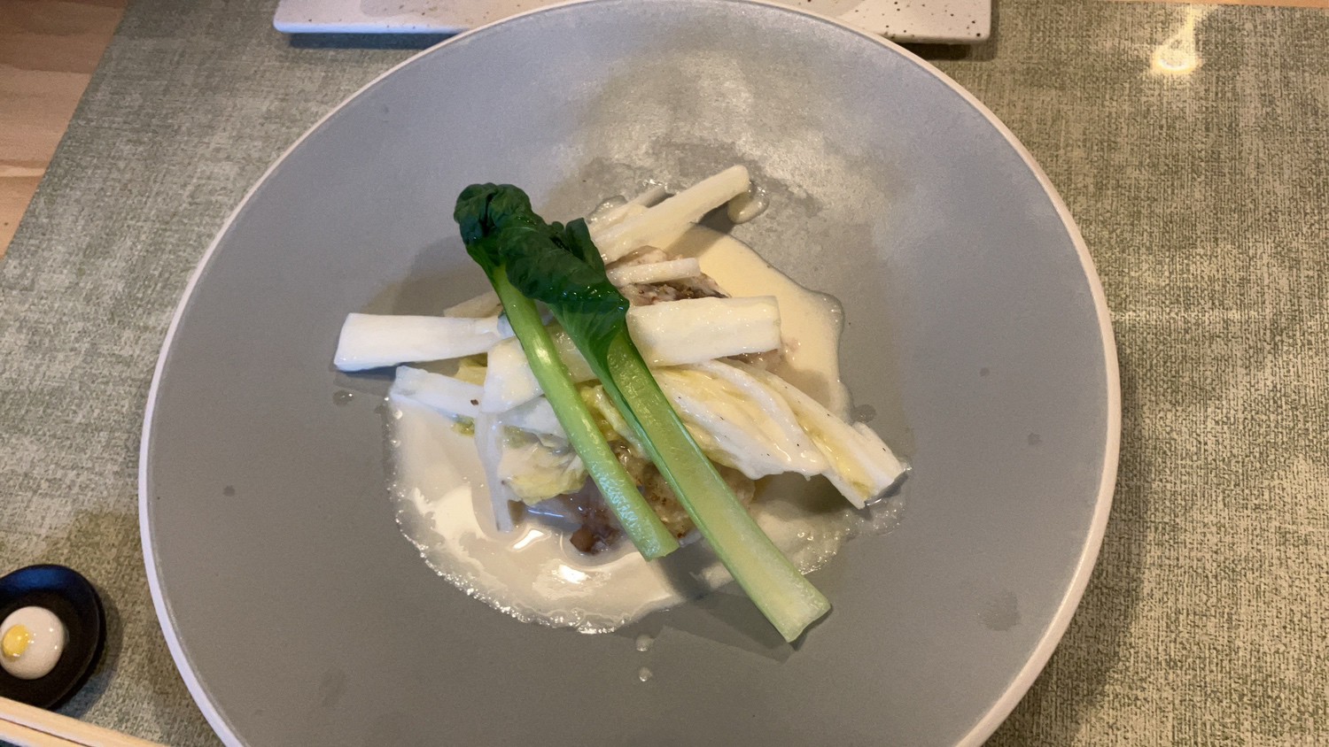 コースの一品例。季節ごとに趣向を変え、葉物野菜を多種類使ったり、焼き野菜や茹で野菜など調理法を変えたり、お肉のコンフィや魚のマリネを合わせたりして、重層的なおいしさを表現。野菜が主役の名作料理です!