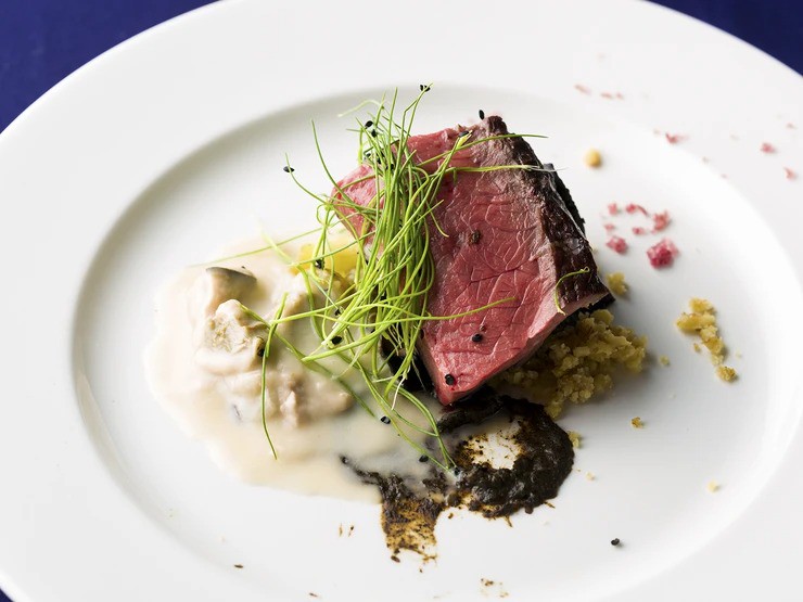 『Temperature 温度』の肉と海のものを合わせるという、斬新な料理の構成。 肉に合わせて、火を入れる温度帯にもこだわると話す鹿澤シェフ。赤身肉の風味が格別な山形村短角牛は珠玉の味わいです。