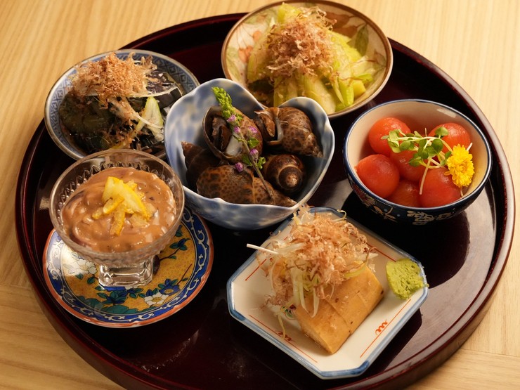 四季の味覚を少しずつ味わえるおばんざいの盛り合わせ。その季節ならではの彩りや風味を大切に仕立てた逸品は一品にも最適。多彩な味わいが一度に楽しめる、食卓を豊かに彩る一皿です。