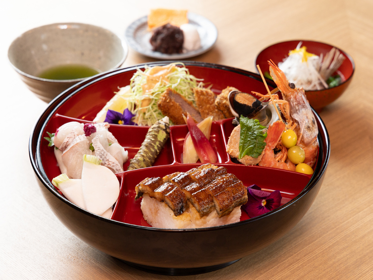 季節感を映すお膳として、鰻寿司・鯛寿司・毎月替わる季節の寿司から選べ、主菜も牛カツ、豚のトマト煮、月替わりの旬の一品を用意。月々に内容が変わる楽しさがあり、食後は甘味と抹茶を座敷でゆったり過ごせます。