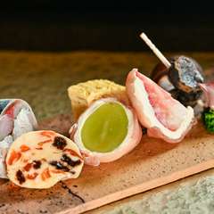 コース前半の一例。旬の山海の幸をふんだんに使い、四季の移ろいを映す食材の数々を少量多品の前菜に。季節に応じて旬果実を巧みに使った一品も登場するなど、新しい美味にも出合えます。写真はイメージ。