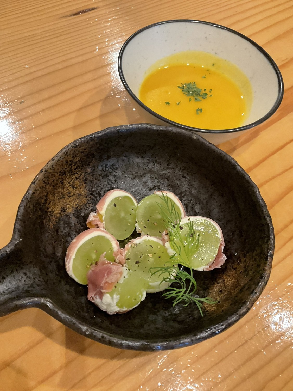 果実の甘みと塩気の効いた生ハムが編みだすハーモニー『シャインマスカットとサワークリームの生ハム巻き』