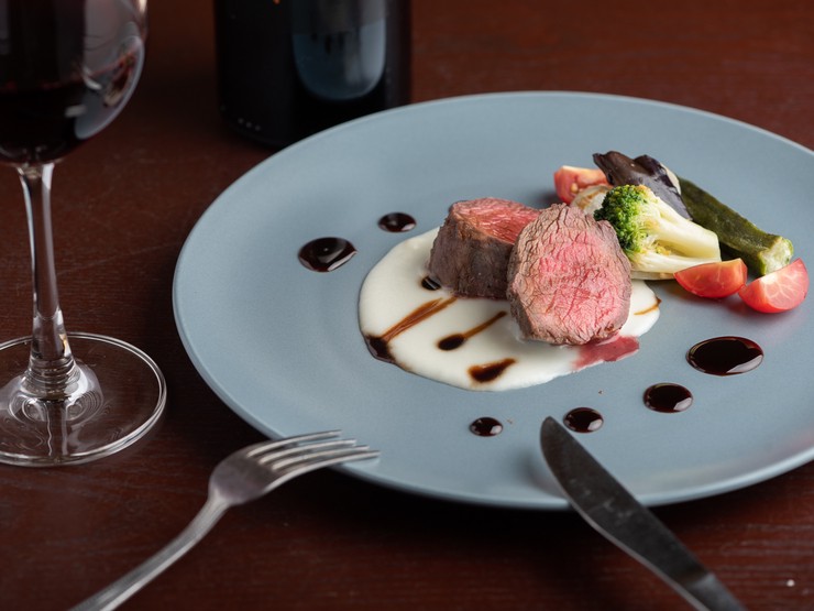 オーブンで焼いた後、じっくり休ませて中までじんわり火を通すことでジューシな仕上がりに。自家製ステーキソースでいただきます。とっておきの料理のため、コース料理のメインとしてだけ登場します。