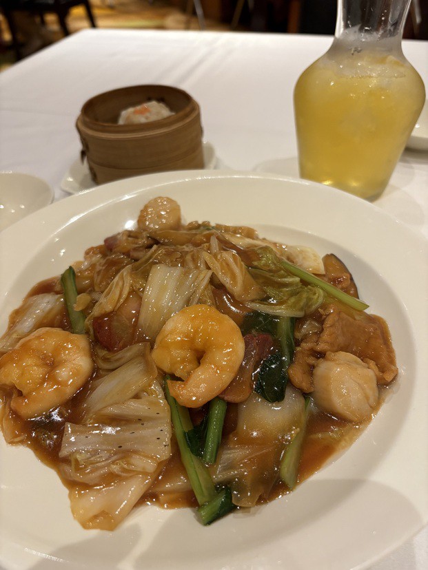 【南国酒家】で人気の高いメニューとして幅広い年代から人気の王道メニュー。茹で蒸しした自家製麺は最後に焼き目を付ける事でおいしさが増し、その上に海老や帆立、たっぷりの野菜が入った五目あんかけは相性抜群。