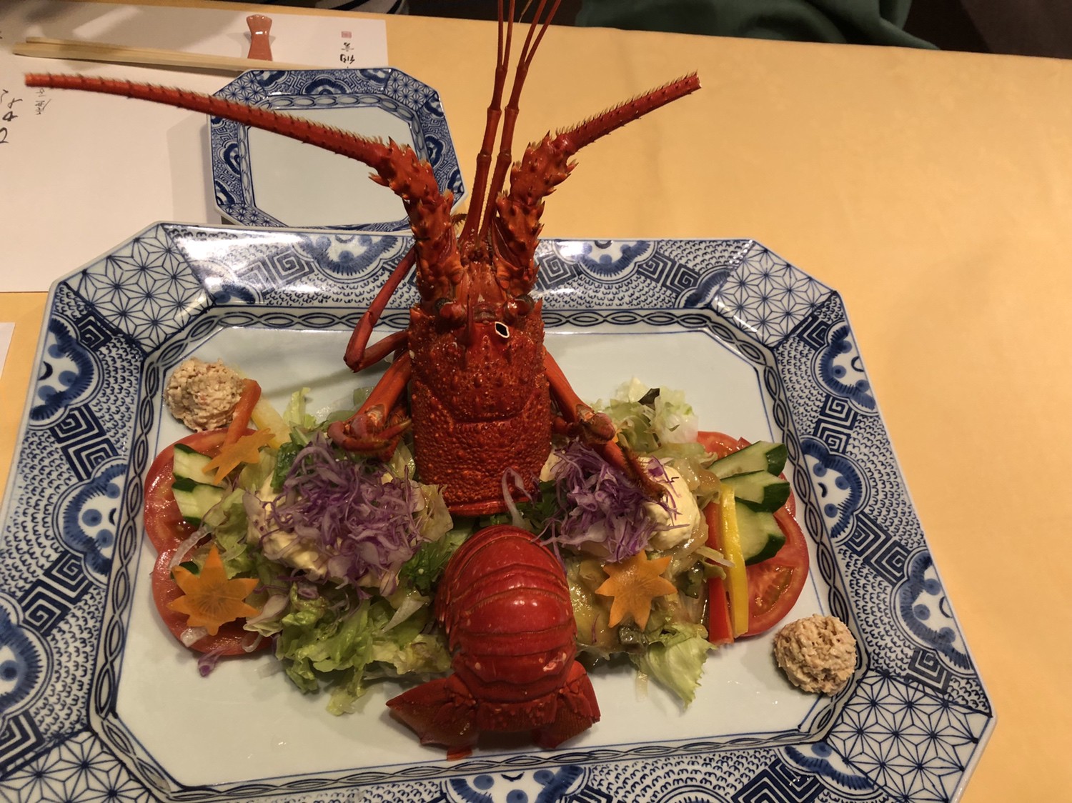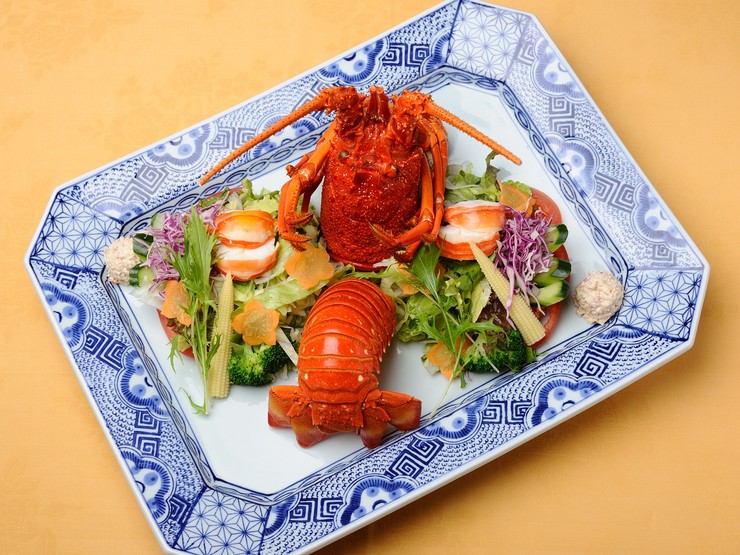 活造りに次ぐ定番の人気メニュー。ボイルされた伊勢海老の身と、新鮮な野菜を取り合わせたサラダです。特製の味噌ドレッシングをかけていただきます。味噌のコクが加わることで、より滋味深い味わいに。