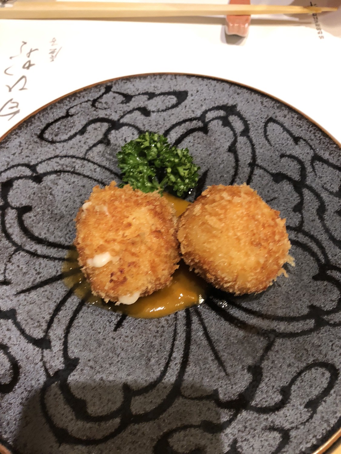【中納言】の名物。半分に割った伊勢海老に、特製マヨネーズソースとオーロラソースを塗って焼き上げられた一品です。芳ばしい香りと色鮮やかな2色のソース、伊勢海老の旨みが、五感を通じて心を満たしてくれます。