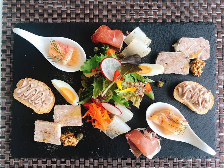 テビチのテリーヌやヤンバル白レバームース、スペイン産生ハムブルスケッタ、エッグピクルス、宜野座村産