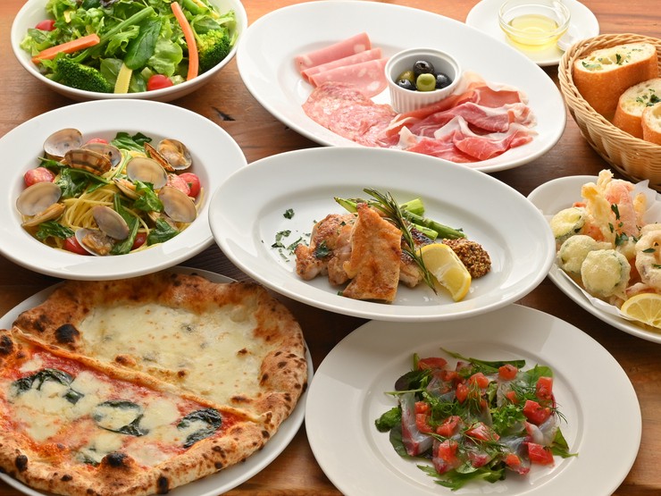 石窯で焼き上げる本格ナポリ風ピッツァが自慢のピッツェリア。イチオシは自慢のピッツァをはじめとした、人気メニュー9品を一度に楽しめる、大皿コース。家族の食事や友人同士、仕事仲間との食事会など幅広いシーンに活躍してくれます。コースは飲み放題も追加できるため、各種宴会・パーティーでの利用もオススメ。オープンキッチンを導入しており、ピッツァを焼き上げる光景を臨場感たっぷりに楽しめることも魅力。アラカルトやイタリア産ワインをはじめとしたお酒も各種充実。デートやお1人さまにもぴったりです。
