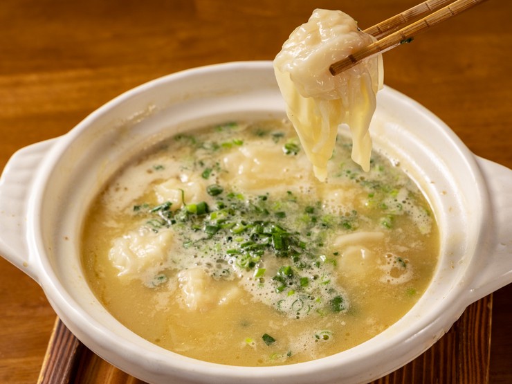 つるりとおいしい自家製海老雲呑を、鶏の旨みが溶け出した濃密鶏白湯スープで。あさりと焼きあごをブレンドした出汁に、鶏ガラを6時間煮出したスープが絶品。お好みで柚子胡椒を添えて、〆はちゃんぽん麺で決まり。