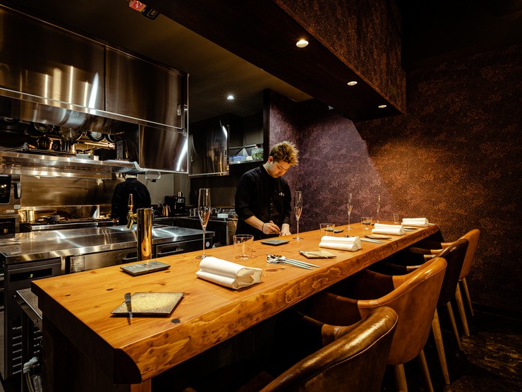 テーマは「心地良いちぐはぐ」。「木と石、不揃いの椅子、一部を和柄の壁紙にするなど相反するものでもバランス良くミックスすることで居心地が良くなる」とオーナーシェフの髙木和也さん。料理も然り。フォン(だし)を丁寧にとるなど伝統を大切にしつつ、独自に編み出した革新的な技法をプラスして食感や味わいで驚かせてくれます。また、レストランとビストロの2つの顔を持っているのも画期的。テーブル席は前菜500円~、メイン2,000円前後のアラカルトでカジュアルに、カウンターは完全予約制で髙木シェフの才能を余すところなく味わえるコースで提供。フレンチに馴染みがない人も行き慣れている人も、楽しませてくれる懐の深いお店です。