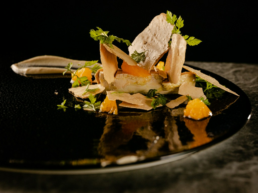 コース料理のスペシャリテ1:フォアグラとパン・デピスのメレンゲ、柑橘と菊芋のピューレ