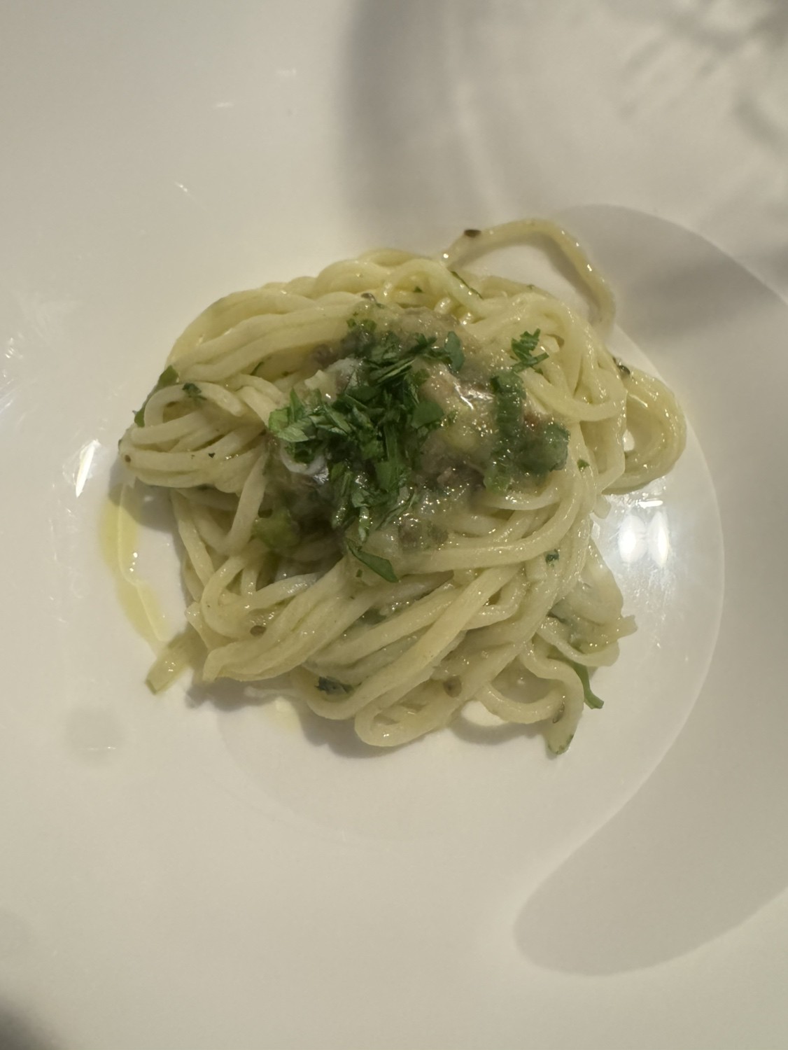 「余計な手を加えずシンプルに」をモットーにしている古井繁規シェフ。9年間料理長を務めていた新宿三丁目【OSTERIA ORIERA(オステリア・オリエーラ)】では、研ぎ澄まされた味わいの魚料理が評判となり、予約困難になるほどの人気を誇っていました。その後南青山【RISTORANTE PEGASO(リストランテ・ペガソ)】で2年間料理長を務め、今年2月、新宿三丁目で独立を果たしました。雑多なイメージのエリアですが、雑居ビルの4階、扉を開ければ幅広のカウンターやテーブルにゆったりとした椅子を配した大人の隠れ家的雰囲気。おまかせコースに、シェフが修業した北イタリアのワインを合わせて心ゆくまで美食を堪能することができます。