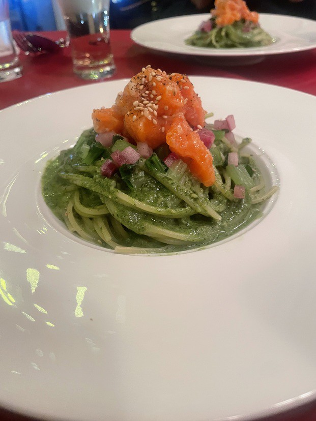 生クリームとトマト、ニンニク、うにを溶け込ませたソースで食べる濃厚なパスタ。コクのある味わいです