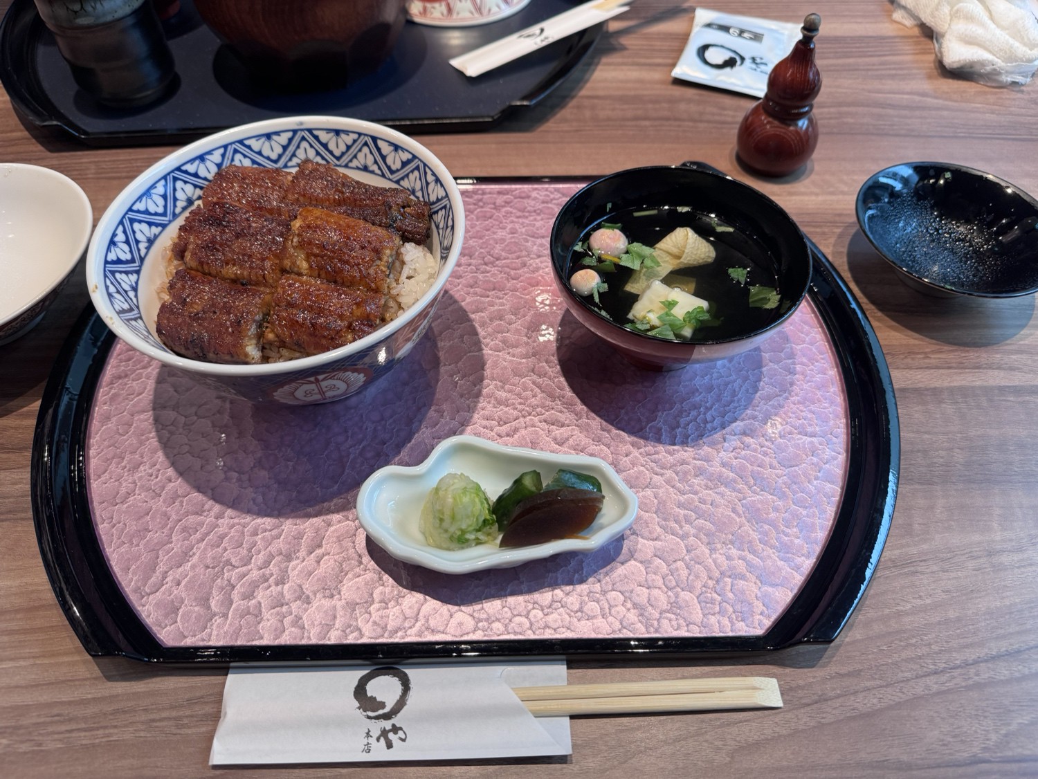 ミニひつまぶしに季節のミニ天ぷら・お刺身2種・茶わん蒸し・鰻と昆布の山椒煮・小鉢がセットになった空港店限定御膳です。