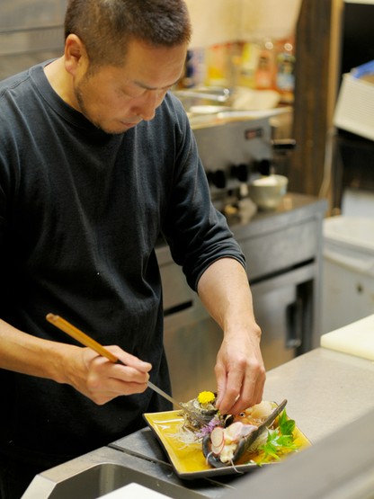 新鮮な魚介類を日々仕入れています。周り一面、山に囲まれている店なので、必要以上に魚介の新鮮さにはこだわります。全て、店主の厳しい目で選別。刺身で食べられる程のものしか仕入れません。それらを使い刺身はもちろん焼いたり煮たり…魚介の持ち味を活かせる料理を考えています。季節毎に採れる素材を大事にし、春には立地を生かした山菜料理が豊富。最も美味しい状態で食べて欲しいので、料理は注文が入ってから仕上げます。