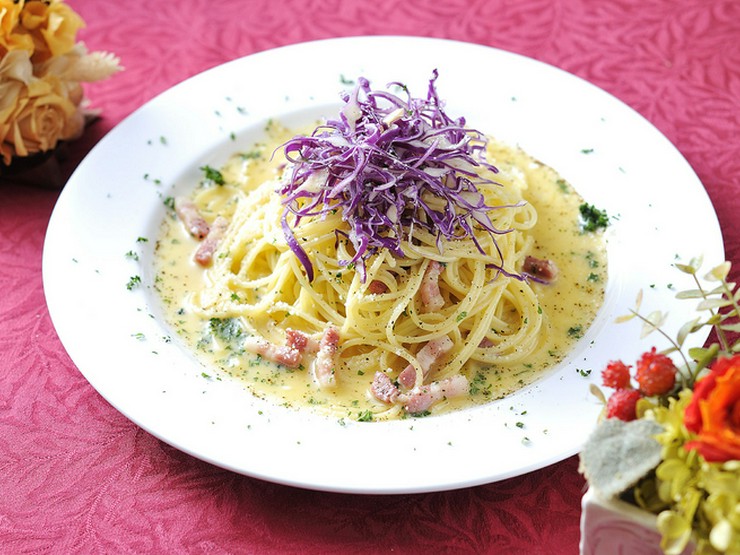 生クリームを一切使わず、カリカリに焼いたパンチェッタと全卵と粉チーズと胡椒とパセリで仕上げたローマ風カルボナーラに、紫キャベツのしゃきしゃき感と食感をプラス