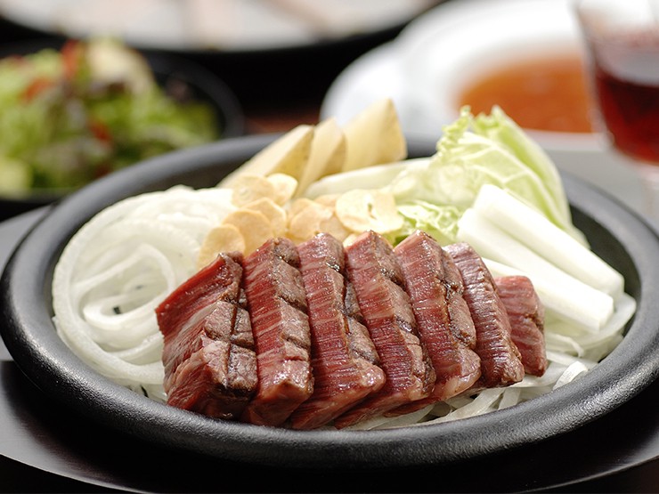 厳選されたステーキのコース料理をお箸でどうぞ。廣岡揮八郎ハムオードブルはオーナー廣岡揮八郎開発のレシピで、うす切りの廣岡揮八郎ハムに冷水に晒したスライスオニオンを添え、生野菜をたっぷり使ったドレッシングをかけて、ハムで包みながらどうぞ。酸味がほどよくさわやかなトマトベースのスープ。そしてリンゴチップスが快いサラダ。滋味溢れる国産和牛肉の厚切りステーキは熱く焼かれた南部鉄の鉄皿でご提供。自慢のポンズたれはステーキ肉をあっさりと仕上げ、焚き立てごはんと好相性。コース料理のはじまりは、「揮八郎ビール」と「ワイン」が最適。とくに「揮八郎ビール」は舌で味わっていただくに十分堪えられるコクがあります。