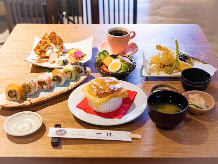 国道156号線沿い、“一休”と書かれた大きな看板が目印の【一休HITOYASUMI 高岡戸出店】。地物の食材を多く使い、本格的なにぎり寿司やリーズナブルなランチなどの和食を始め、名物のワッフルデザートなども提供しています。店内は少人数から使える個室や、20名ほど集まれるテーブル席、30名ほど収容可能な座敷など、人数や用途に合わせ使い勝手の良い部屋を完備。そのため大勢の人が冠婚葬祭やパーティなどで利用するため、特に週末などは早目に予約することをおすすめ。広い店内を切り盛りするスタッフの優しく丁寧な接客が嬉しく、いつも温かく迎えてくれる雰囲気や綺麗な盛付けの美味しい料理に感激し、何度も訪れたくなるお店です。