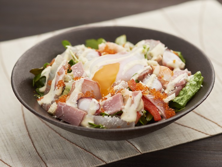 タコやエビ、他にお刺身でも食べられるその日の旬魚が盛り込まれています。シャキシャキとした野菜と海の幸、ベーコンが入った食べ応えのあるオリジナルシーザーサラダ。温泉卵のまろやかさが加わり絶品です。
