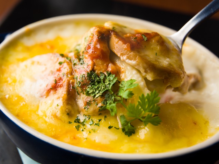 バターや小麦粉で丁寧につくるベシャメルソースを使い、濃厚な「あん肝」をグラタンに仕立てました。マカロニ、ジャガイモ、チーズ、そしてあん肝が、ソースと抜群の相性です。