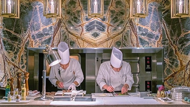 モダンで高級感溢れる大人の空間。店内では、那覇の街並みを眺めながら、大切な人と特別な時間を過ごして頂くことができます。メニューに使われる素材は国内外問わずシェフが厳選した上質なものばかりで、中には、シェフが自ら足を運び選んだものも。また、調理法は食材が持つ良さを最大限引き出せるようこだわっています。中でも、メインディッシュを目の前で焼き上げる「レインフォレスト」と呼ばれる天然石のダッチオーブンでは、音や香りを通して調理の過程も楽しんで頂くことができます。