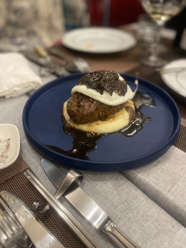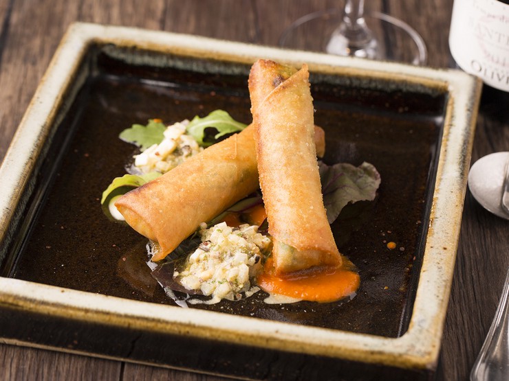 白子に似た味がする豚の脳みそにグリュエールチーズやマッシュルーム、エスカルゴバターなどでさらにコクを加えて皮で包み、馴染み深い春巻き風に仕上げています。カリッとした皮からトロットした具材があふれます。
