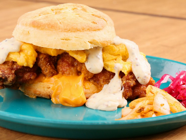 ニューヨークで流行っている甘いビスケットに、アメリカのチェダーチーズと道産の鶏ももを使った唐揚げを挟み、特製グレービーソースをかけてお召し上がりいただきます。ビスケットは道産小麦を使い店内で手づくり。