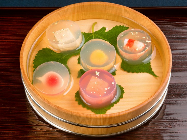 コース料理の最初の皿『先付』は、暦に応じた季節感を表現。7月は七夕の乞巧奠の供え物を表現し、鮑やフォアグラなどをゼリーに包んでいます。10月は重陽の節句にちなむなど、各月ごとの趣向を楽しめます。