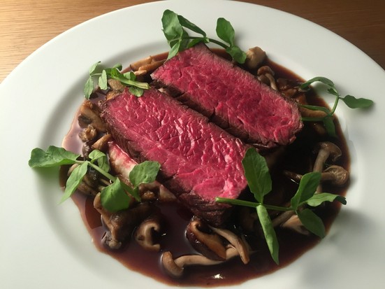 • 牛ハラミのステーキ 山葵風味の赤ワインソース