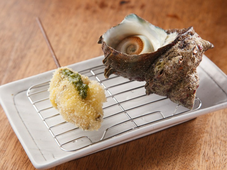 新鮮な生のサザエを使用し、肝も一緒に串揚げにしております。一口食べると磯の香りが口に広がり、お酒が進む逸品です!仕入れにより売り切れの場合があります。