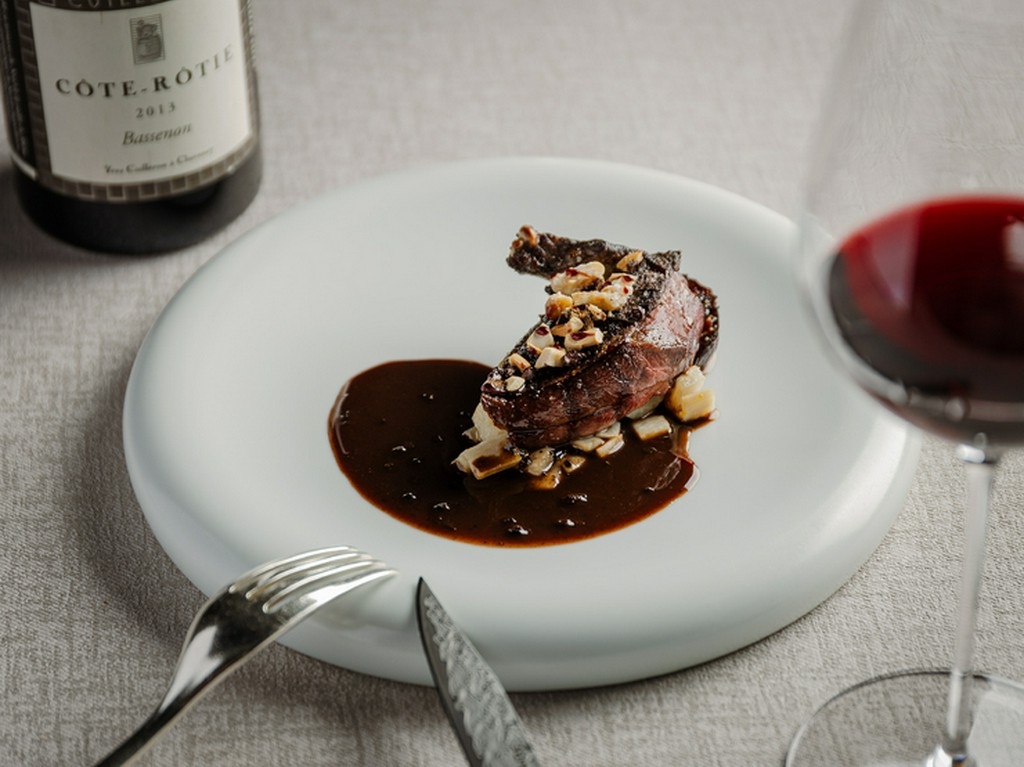 やわらかで繊細な身質を活かすために低温調理してから0℃前後で1週間寝かせた仔鳩は驚くほどしっとり滑らか。レバーを使う伝統のサルミソースの上には、さまざまな食感のナッツをのせて味わいの変化も楽しめます。