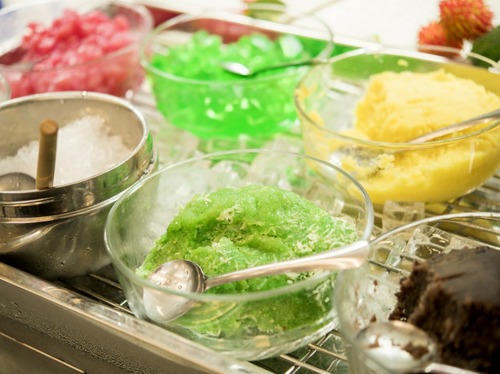 もち米、緑豆、寒天、ココナツミルク、氷、ピーナッツが入っており、食べる前に全体をかき混ぜます。ココナツのミルクの味わいが口の中に広がり、クワイのサクっとした食感もポイントです。