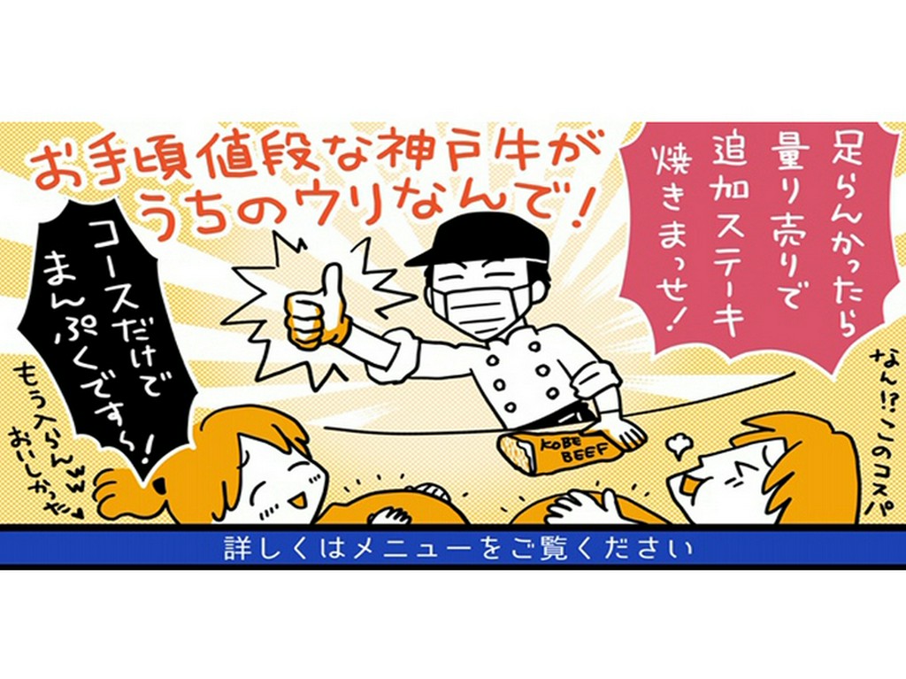 神戸牛のステーキや、本格ハンバーグをファミレス感覚で、リーズナブルに楽しめます。