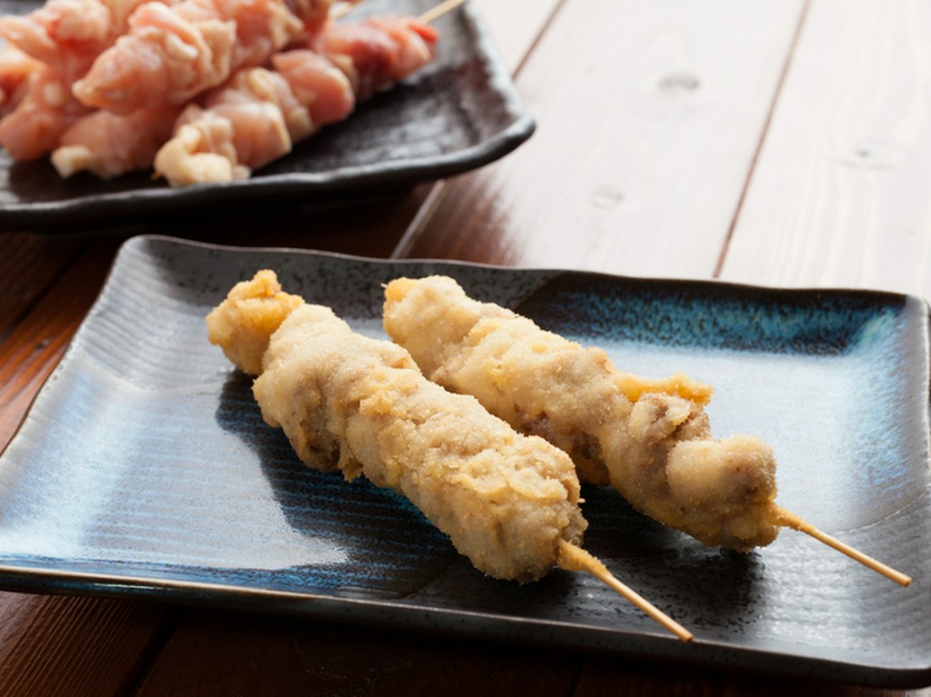 他店ではあまり見ない、30cmという長さのアスパラを国産の豚バラで巻いた女性人気一番の定番メニューです。自家製の秘伝タレの風味とサクサクの衣とアスパラのホクホクした食感が楽しい逸品。