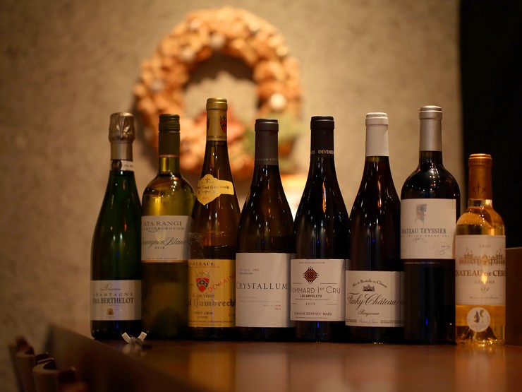 グラスワインを日替わりで8種ご用意。シャンパーニュ1・白3・赤3・貴腐ワイン1があり、天ぷらやアラカルトと合わせると、お互いの味わいを高め合う魅惑のマリアージュが可能。セレクトのお手伝いも喜んで!