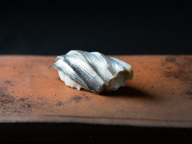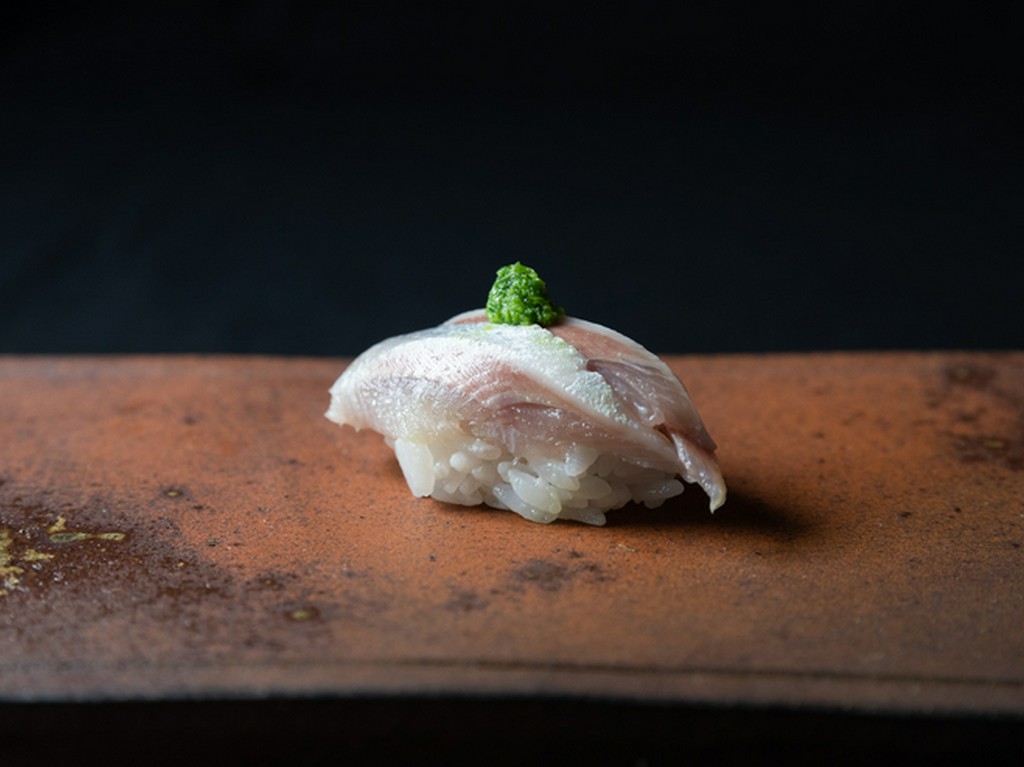 光り物の王道・こはだは脂ののったものを、米酢でしっかりしめてキリッとした仕上がりに。季節によって一番良い産地のものを、豊洲の仲卸業者に目利きしてもらって仕入れています。画像は大分産のこはだを使用。