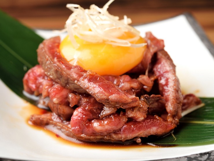 備長炭の豊かな香りをまとった赤身肉を、自家製タレと卵黄と絡めてひと口。ローストビーフのようなイメージで、鮮度と肉の旨みを一度に楽しめる【やきにく喜咲】ならではのユッケです。