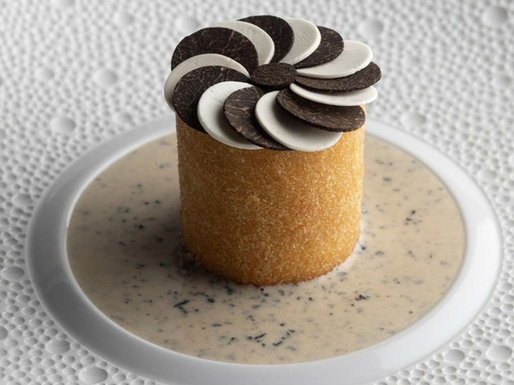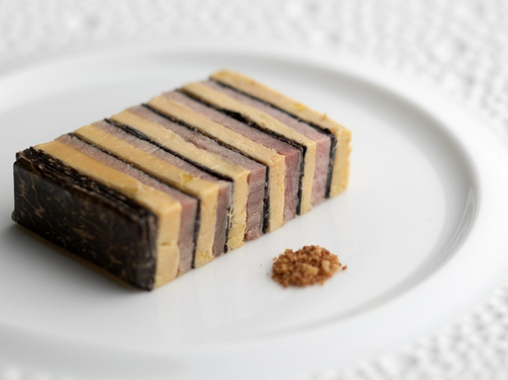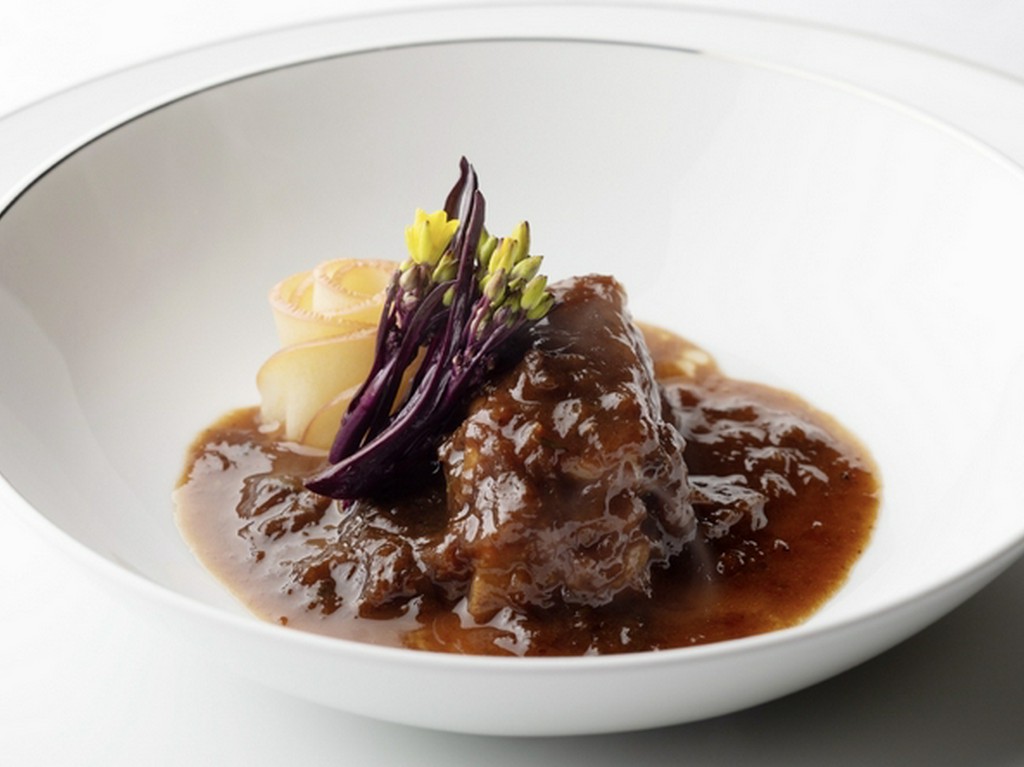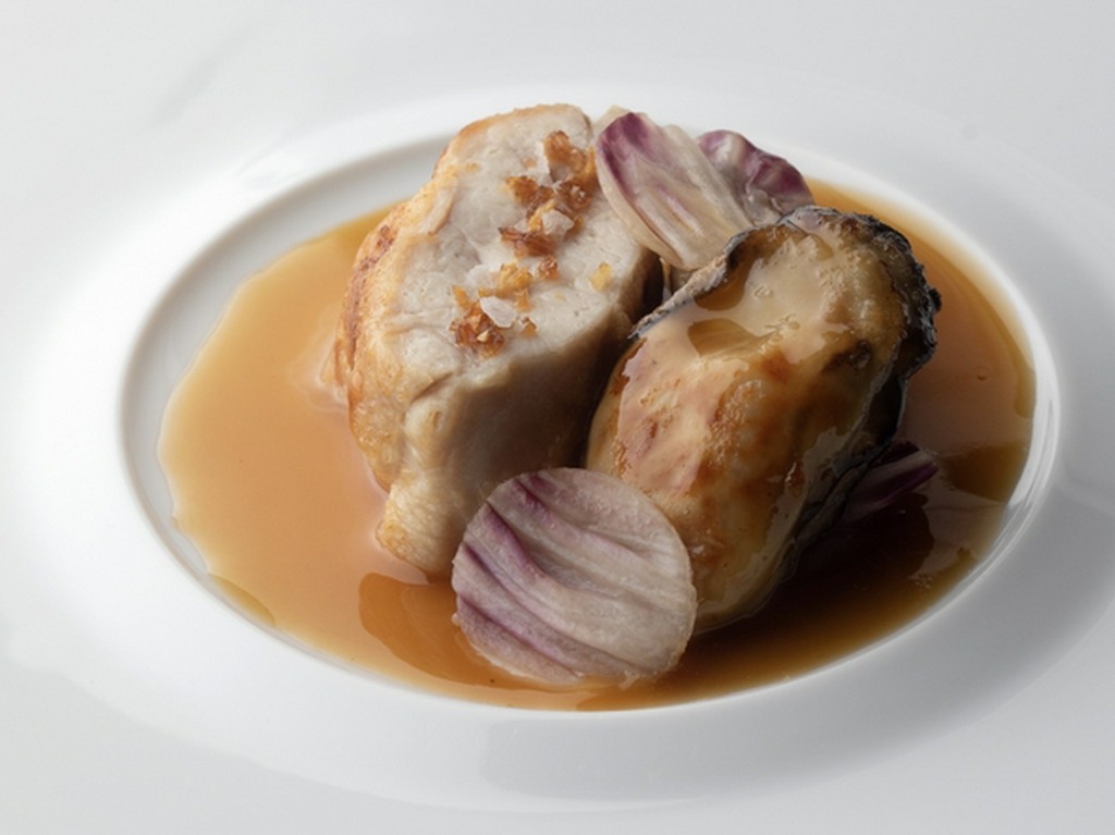 丁寧な神経締めを施したクリアな味わいの鱸にキノコのバターソテーを挟み、細かく刻んだジャガ芋で包んで焼き上げた逸品。重層的な素材の香りとデーツビネガーの酸味のあるソースで味の広がりを楽しめます。
