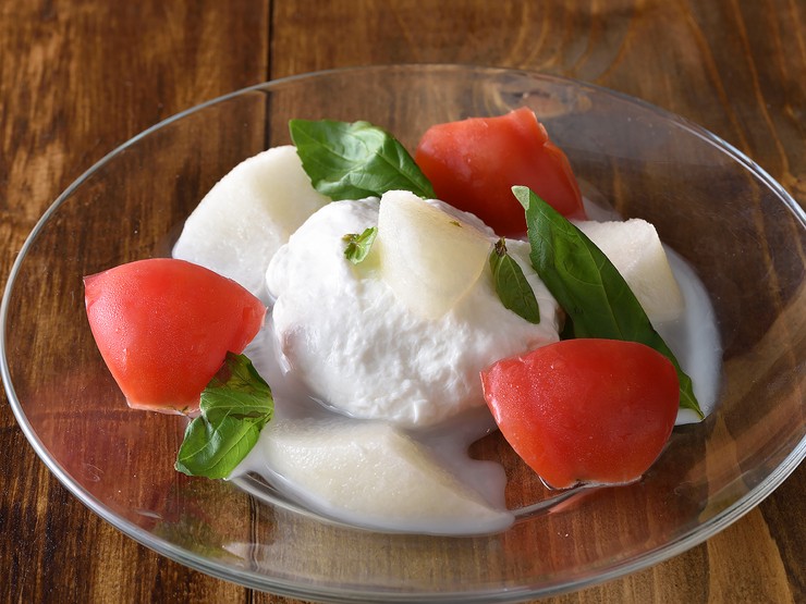 毎日、お店で手づくりする自家製モッツァレラチーズが大人気。神奈川の牧場直送の地ミルクを使うので、フレッシュな美味しさが極上。旬のフルーツと合わせた小皿をお通しとして、楽しんでいただいています。